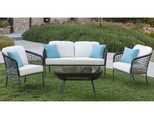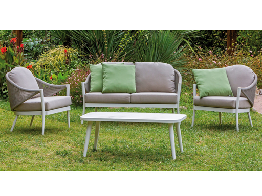 Garden set with aluminum frame and rope consisting of 1 sofa, 2 armchairs and 1 oval table with tempered glass top. The solid aluminum structure is...