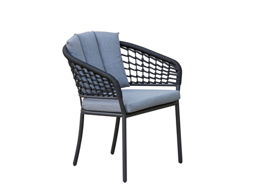 View full detailsGarden set composed of two armchairs and a round aluminum table powder coated in black. The grey synthetic rope trim and the grey 230gr polyester f...