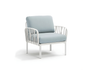 Relaxing armchair with fiberglass resin and padded armrests. Can be purchased individually or designed as a compositional element in larger sets provided by the Komodo modular seating collection.