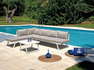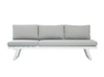 TUNISI corner set, consisting of 2 3-seater sofas that can be converted into sunbeds, a 68 x 68 x 41 cm coffee table with an aluminium slatted top, a white aluminium frame, and sand-coloured cushions with removable covers.